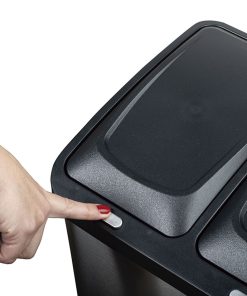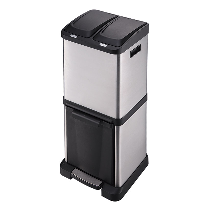Este cubo está fabricado en acero inoxidable satinado antihuella. Incorpora un pedal en la base para abrir el compartimento frontal de una forma automática sin utilizar las manos. En la parte superior del cubo incorpora 2 tapas con pulsador para una fácil apertura. Tiene una capacidad de 32 litros y vienen repartidos de la siguiente manera: 8×2+16 litros. Las dimensiones totales son 32,5×32,5xh.77 cm. Las cubetas superiores tienen unas medidas de 12,6×21,2xh.33,8 cm y la cubeta inferior: 23,5×23,5xh.30 cm.