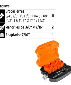 - 11 Brocasierras 3/4″, 7/8″, 1″, 1 1/8″, 1 1/4″, 1 3/8″, 1 1/2″, 1 3/4″, 2″, 2 1/4″ y 2 1/2″