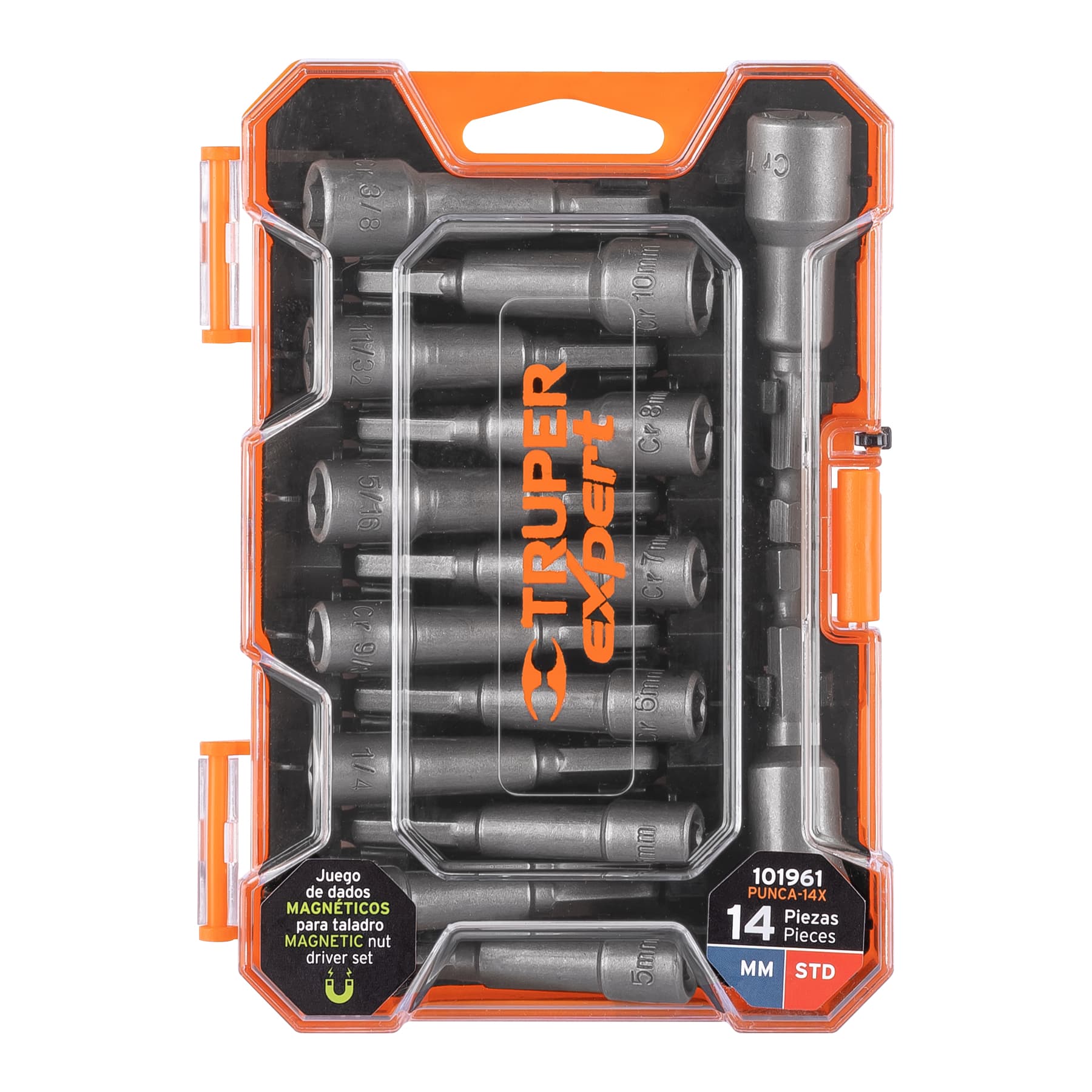 - 7 Dados magnéticos: 3/16″, 1/4″, 9/32″, 5/16″, 11/32″, 3/8″ y 7/16″